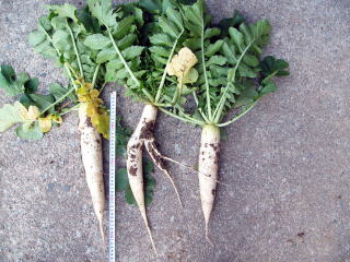 大根のお試し収穫を行った。余り大きくなりすぎていると本格収穫までに芯が入ってしまうので、何でもそうだが適度な大きさにするのが難しい.。大きさは種の蒔き時にリンクする。