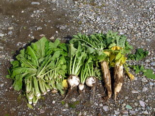 お試し収穫の秋野菜。左から野沢菜、白かぶ、タクアン大根.