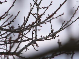ウメのつぼみも膨らんだようです。先週のウメ剪定、正解でした。