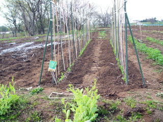 昨日の「春の嵐」が一転、穏やかな一日となった今日、サヤエンドウの支柱立てを行った。朝7時からの作業である。サヤエンドウも一気に成長するが、10センチほどになるとツルが何かに巻き付きたくなる。30センチ程度になるとパタンと倒れてしまう。