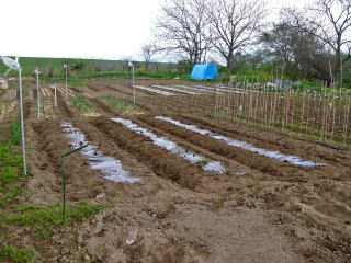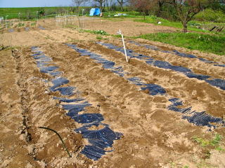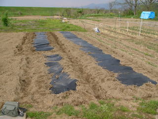 連休中にナス、キュウリ、シシトウ、トマトの苗植え付けをするのでこのためのマルチ張りをした。