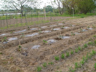 昨日、購入したナス苗木の定植をした。1本98円で接ぎ木でない普通のナスである。キュウリ、シシトウ、トマト同様安価な割に安定した収量を確保している。苗の植え方はシシトウ、トマトと同じである。これで苗定植は全て完了した。