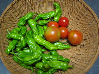 初収穫のシシトウとミニ、中玉トマト。夏本番です、