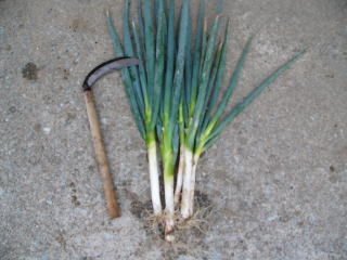 家の者からそうめんにネギが欲しいとせがまれ、「それでは」と、お試し収穫をした。焼き鳥串のようなネギ苗を1本ずつ植えたネギが写真のような立派なネギとなった。