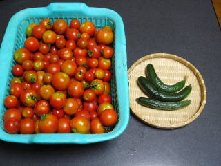 初収穫となったキュウリ。神前、仏前に供えました。トマトは相も変わらず絶好調です。ジュースにしていただきました。 2008.08.10 17:30 撮影