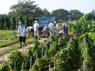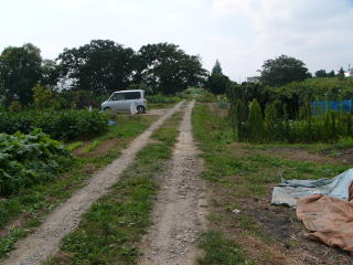 河川敷内畑にトラック、乗用車が通行する農道は砂利敷きのため輪立ちでき、往来がしにくくなる。このため農道利用者が一堂に会し農道の整備作業を行う。いわゆる地域版「結い」の共同作業だ。