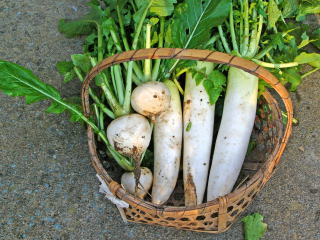 早朝収穫の大根とかぶ。大根はおでんにしていただきました。