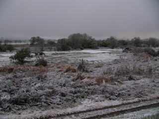 とうとう来ました白い季節。中央白く見える付近がおらホの家庭菜園です。、2008.11.19 6:45 撮影