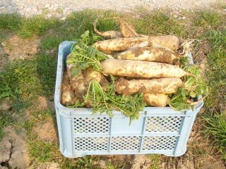 ジャガイモを植えつけた箇所から越冬大根を収穫しました。