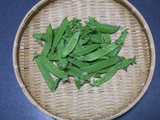 初収穫のサヤエンドウ。油炒めにしていただきました。