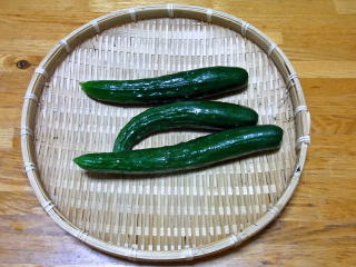 キュウリのお試し収穫です。伸びきった枝部からのキュウリで