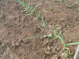 雑草が目立ってきたニンニクの土寄せをした。芽出しが遅く、洪水で種ニンニクが腐れたのかとの心配をよそに見事に芽が出揃っ