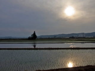 水の張った田園風です。田植えも終わり、3ヶ月経つと