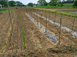 からだ。悪戦苦闘、数時間を描けて立派な支柱(棚)を完成させた。ナス、トマト、シシトウの支柱立ても完了した。