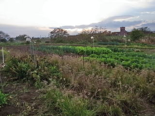 日の入れ間近のおらホの家庭菜園。日が極端に短くなってきました。 この写真補正をかけていますが夕暮れ時です。中央の草むら?は ニラの枯れ穂です。 2012.11.13 16:02 撮影
