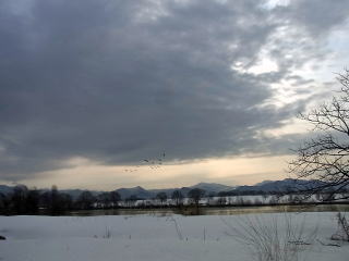 見にくいですが写真中央部に白鳥たちの飛行練習...。 2013.03.13 8:18 撮影