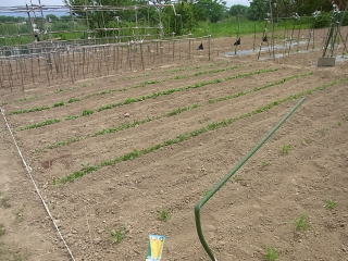 苗野菜も適度な降雨と気温で順調な生育。成長に併せて支柱立てのタイミングも重要で、タイミングを逸すると倒れてしまう。