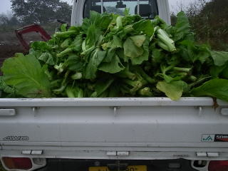 山形青菜は知人へのおすそ分け。ここ何年間とリクエストを請け、これに応じて、1回目のおすそ分けは軽トラ荷台の半分の量となった。収
