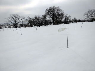 おらホの家庭菜園は雪原状態で積雪50センチくらい。風車の 鉄パイプと比べるとよくわかります。 2015302.08 9:50 撮影