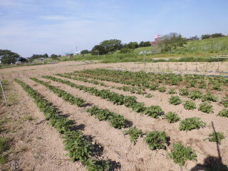 好天続きでジャガイモのにはうってつけrの条件。だからこそ土寄せが必要で気がかりであった。ようやく1回目の土寄せを完了した。体力も