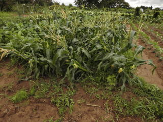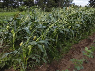 倒れる。案の定トウモロコシが倒れかかっていた。トウモロコシ、地面居着くと腐れルので立て直しの作業を強いられた。