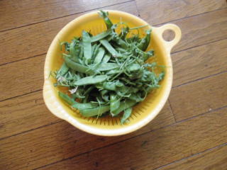 今日の収穫、サヤエンドウ。半分を大裾分け。バター炒めして