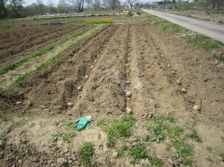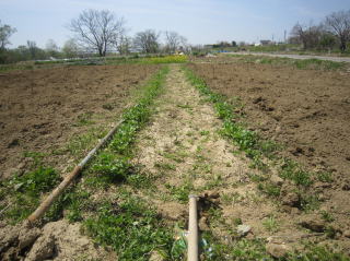 ジャガイモの畝の中に五月菜。こういうレイアウトしたくなかったのですが...。2018.04.22 10:42 |