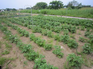 ジャガ芋、花7部咲き。全部2~3本立ちにしています。