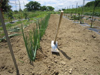 | 1週間ぶりの農作業。やはり、雑草が蔓延っている。雑草取りをするには乾燥しすぎて土が硬く、取りにくい。 ネギの土寄せを優先的にした。それにしても一雨欲しいところだ。 |