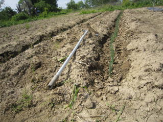 畳針のように細かったネギ苗を植え付けてから20日あまり。1回目の土寄せをした。今年のネギ、すこぶる元気である。