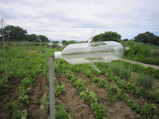 番外編のベニバナ。ビギナーズラック?1m30cm位の背丈になりました。2019.07.06 10:52 ペットボトル風車鼠撃退機。意外に効果があります。作り方はコチラ