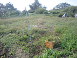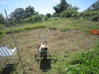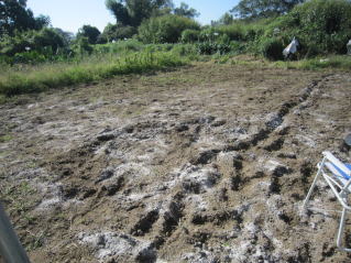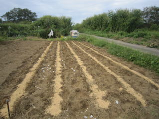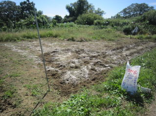 | 石灰を蒔きました。2019.09.14 11:05 | 雑草を全部取りました。後に石灰を蒔いて耕耘完了。地ならレ-キングが辛い。2019.09.15 8:32 |