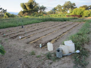 早朝の水かけ、白菜の定植