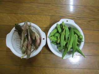 本日の収穫オクラ。左は、屋敷内にあったミョウガ。2020.09.13 17:41