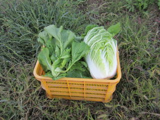 今日の収穫。左、間引き山形青菜。みぎ、白菜。2020.10.25 15:46