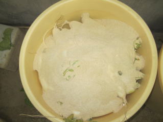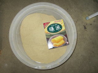 たくあん漬け用大根。1週間前に収穫し、水洗いして干していた。2020.11.29 14:49 黄色い粉は米ぬかに塩を入れてかき混ぜた。。これに市販のたくあ付けの素。ん用山形青菜の収穫、移送。これもお裾分け。2020.11.29 14:48
