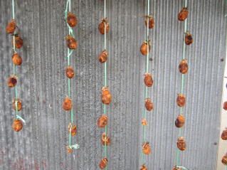 左白菜、右大根。2020.11.27 14:52 作業小屋の軒先につるした干し柿。甘くなってきた。2020.11.29 15:01