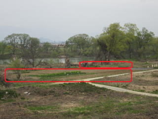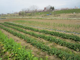 | 間もなく収穫、五月チジミ菜。(中3畝)2021.04.17 7:55 | おらホの家庭菜園、最上川堤防から。2021.04.17 7:59 |