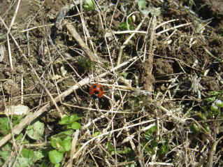 | 春らしいポカポカ陽気。農作業には寒からず、暑からず絶好の気温、天候。雑草取りに汗を流した。恥ずかしながら、この時期での雑草取りを長年したことがなかった。 七星テントウムシを発見。春が来た。 |