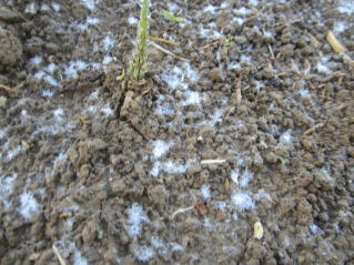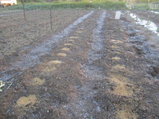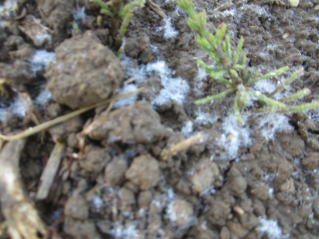 | 天気予報では霜注意報。霜が降ったら水かけることと亡き父から教わっていた。 現場みると何やら白い風景。よく見ると凍っている。なるほど霜害とは幼葉が凍ること。水をかけて氷を解かす。理にかなっている。 |