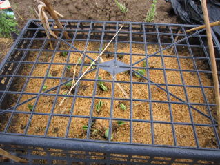 ポット苗カゴが野ハト被害防止に役立っている。2023.05.16 5:53 長芋支柱立、全部完了。自生のカヤを有効利用。2023.05.16 5:52