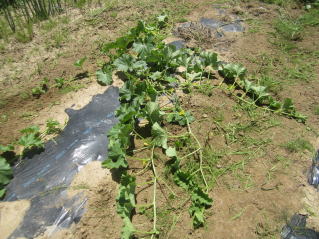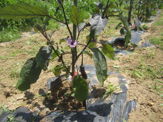 | メロンの雑草取り。できる限り炎天下でのツル返しを避けるようにした。2023.06.25 11:40 | ナス雑草取り完了。実がついている。2023.06.25 12:39 |