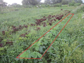 | 紫に見えるのがシソ。収穫を待つ。赤線内が秘伝豆。土寄せを待つ。2023.07.13 5:43 | |