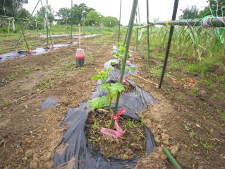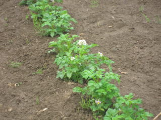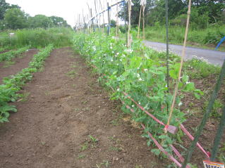 | ジャガイモ開花、、キュウリ、トマトの芽欠き。収穫間近サヤエンドウ。 | |