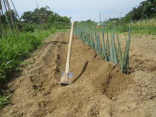 秘伝豆定植とニンニク収穫。ジャガイモ、タマネギお試し収穫。大根収穫。