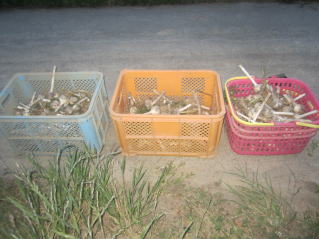 明日雨なので急遽ニンニク収穫。雑草は機を見て行うことにした。2024.06.22 18:47 回収する時、大きさ分別。黄色コンテナ、ピンク篭は大、青コンテナは中、小。今年は全体的に大きめであった。夕刻までかかった。2024.06.23 19:09