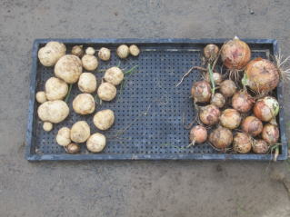 今日のお試し収穫。右、ジャガイモ。左、タマネギ。2024.06.23 5:33 大根収穫。2024.6.23 6:21