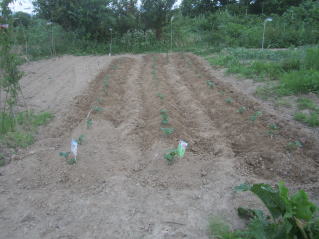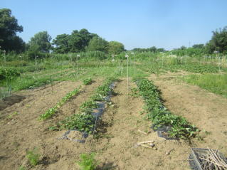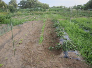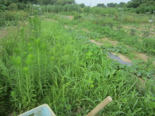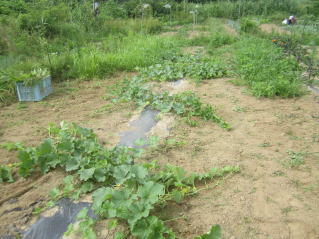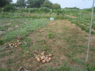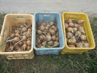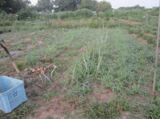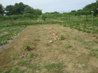 | 6月30日夕刻から降雨の天気予報。せかされる様にサツマイモ、メロン、ニラ雑草取り。タマネギ全部収穫をした。おかげで農作業がはかどった? メロン結実確認し、ナス、シシトウ、キュウリ収穫をした。 |