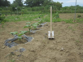| 秘伝豆、土寄せ完了。倒れ防止を兼ねている。2024.06.29 17:28 | UP。約30分かかった。2024.06.29 17:28 |