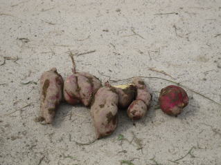 里芋お試し収穫。これで一株、まだ小さい。2024.09.28 12:10 サツマイモお試し収穫。まずまずの大きさ。若干、野ネズミの被害あり。2024.09.28 12:10